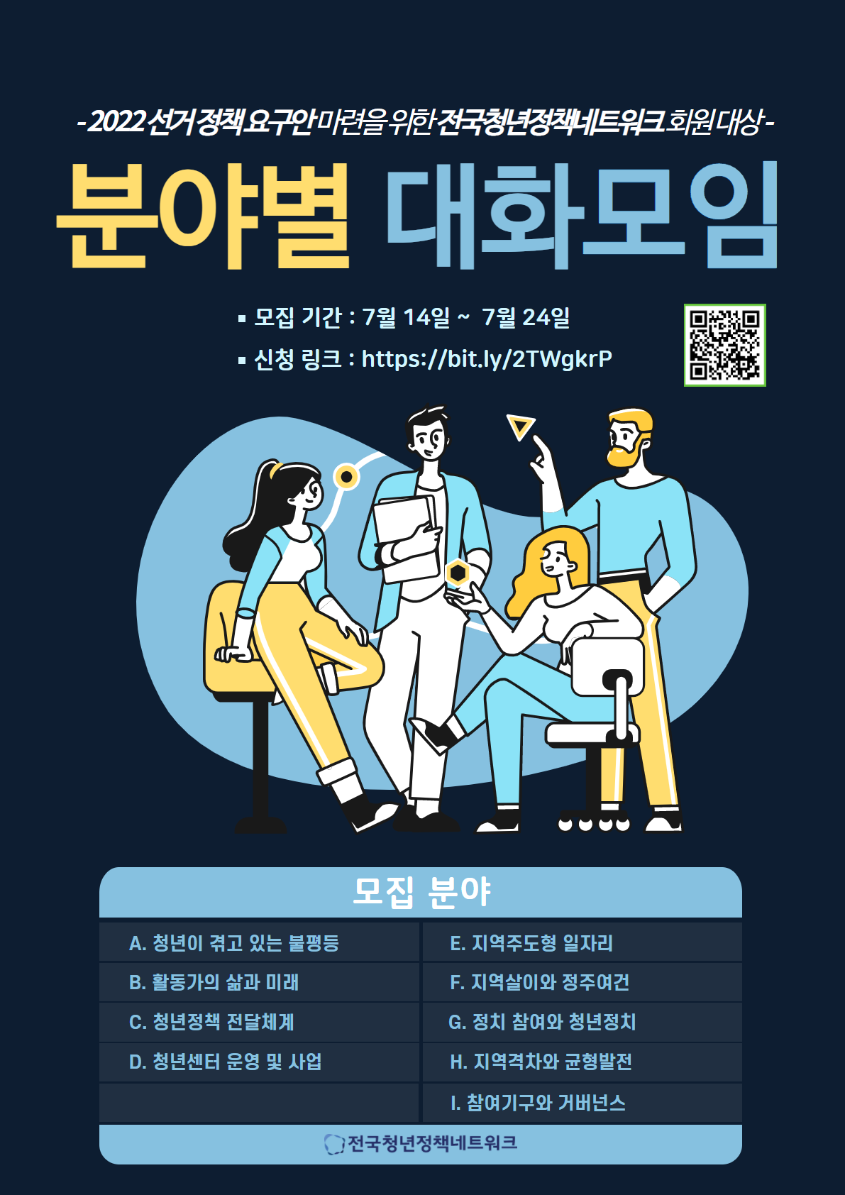 우선 모임을 진행하기에 앞서, 참여할 회원을 모집합니다. 아래 분야를 확인 후 정책요구안 마련을 위한 대화모임에 함께 해주시면 감사하겠습니다.